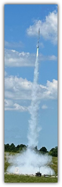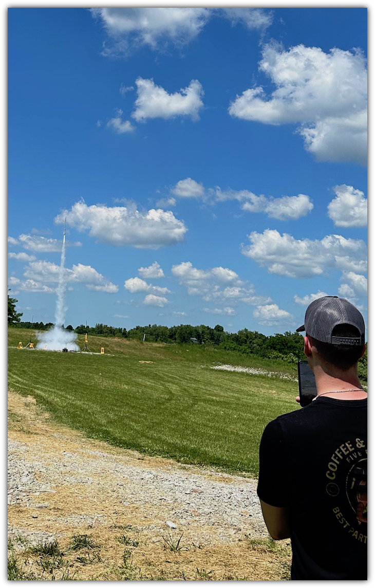 Kian Kissinger watches as his Level 2 Certification rocket the Falcon 5 lifts off on an Aerotech J-500.