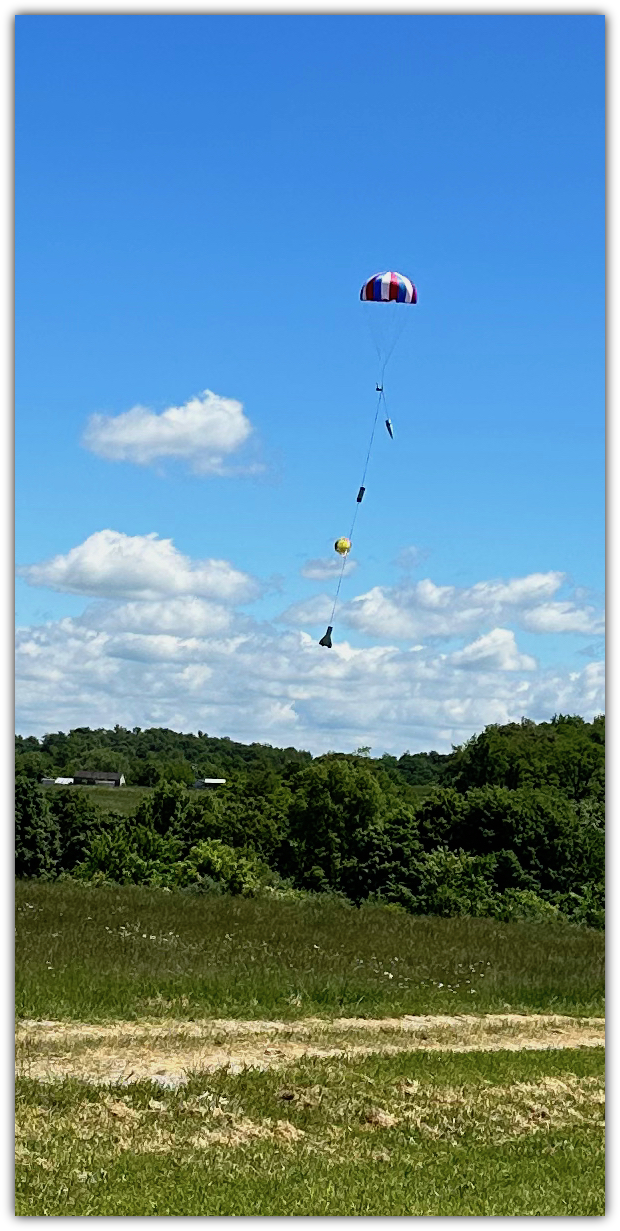 Landing in the overgrown infield, the Thumper looks picturesque under its parachute.