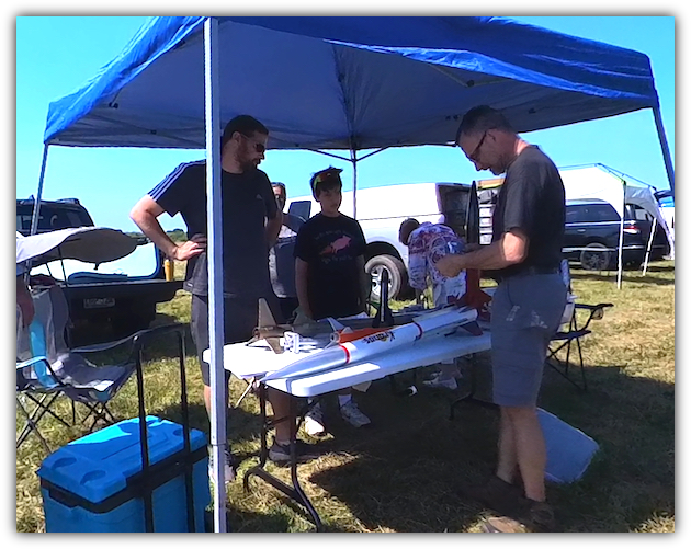 New TRIPOLI members, Brian and Emmett White prepare thier Kronos rocket while Joe Pscolka provides some advice before Brian's Level 1 Certification flight.