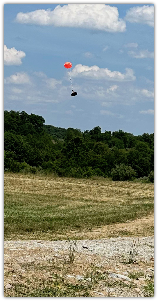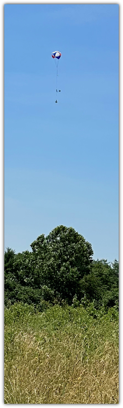 A perfect parachute deployment did not keep the Cow from ending up in the western forest towards the river.