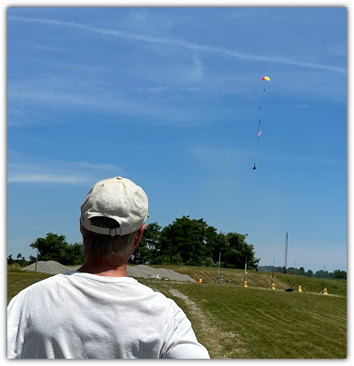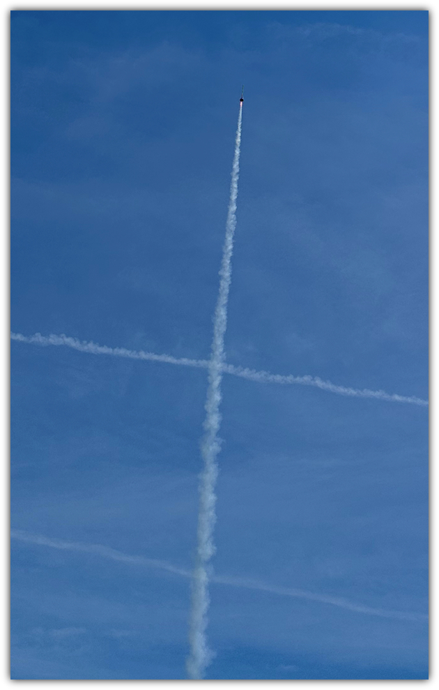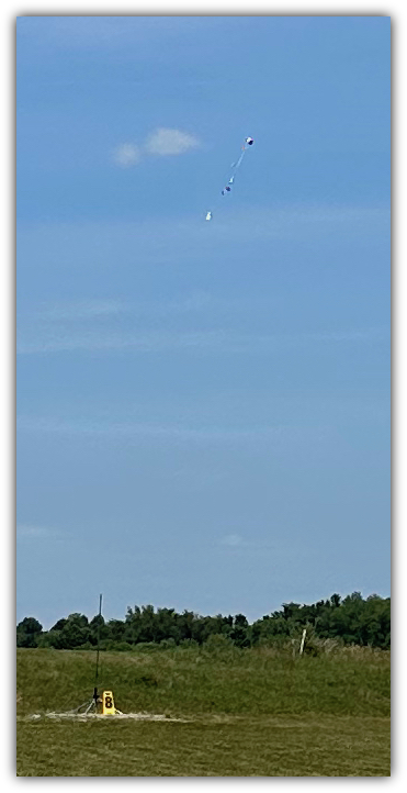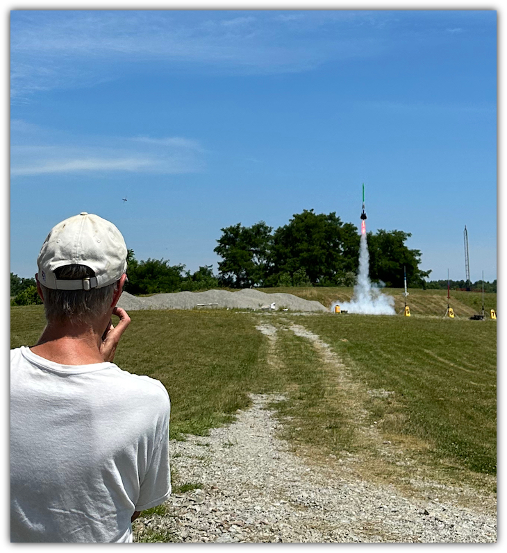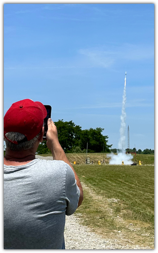 Shooting pictures with his phone, Jeff Dick watches his AGM Pike liftoff on an I-470 motor.