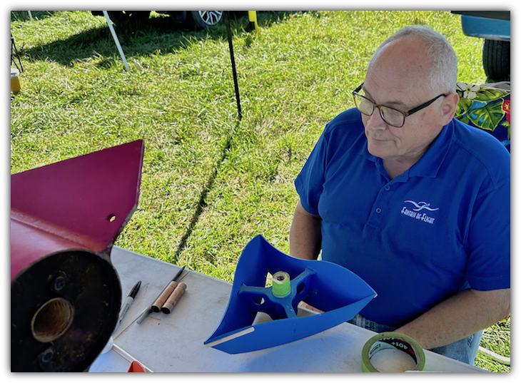 Casey Andre assists John Haught in the assembly of John's jumbo Honest John.