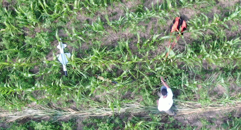 Unhappy winds carried Steve's Talon into the Duda cornfield. An easy find for the Drone Crew. Launch photo coming soon...