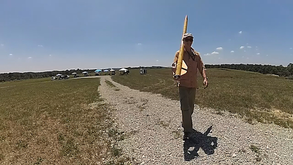 Tom O'Donnell carries his Funeral Rocket to the launch pad.