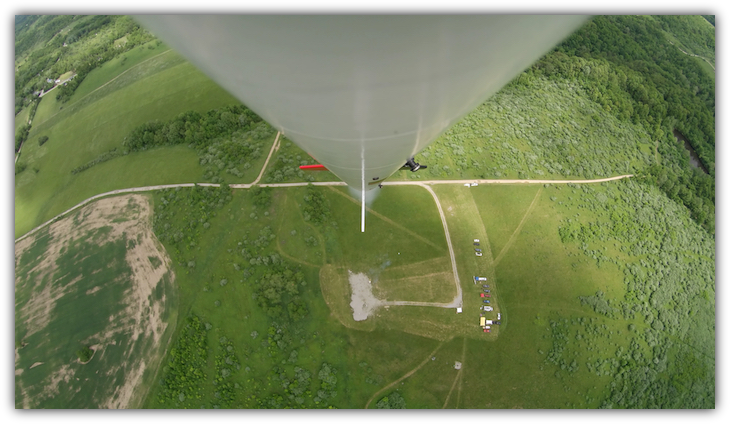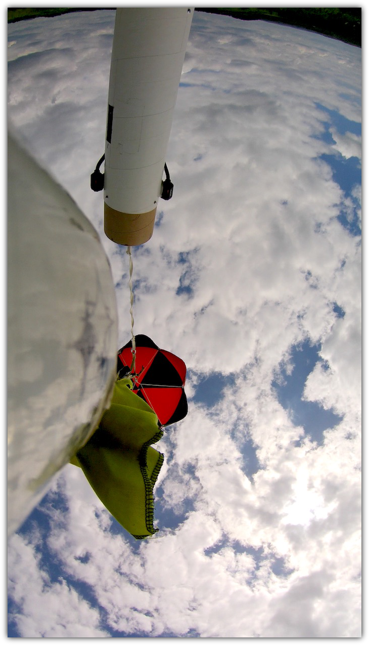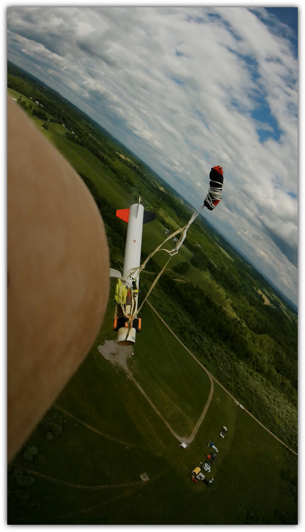 For the May launch, an additional payload section was added for the two HelmetCams. The payload section can be seen just above the black ring that holds the orange cameras.