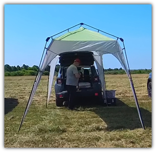 John Haught beats the heat under his tent waiting for the start of the launch day.