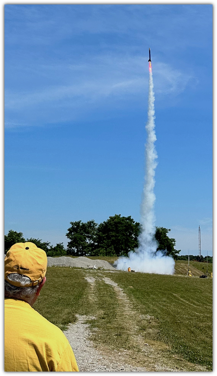 The red flame from the Aerotech K-1275 Redline motor is clearly visible upon launch.