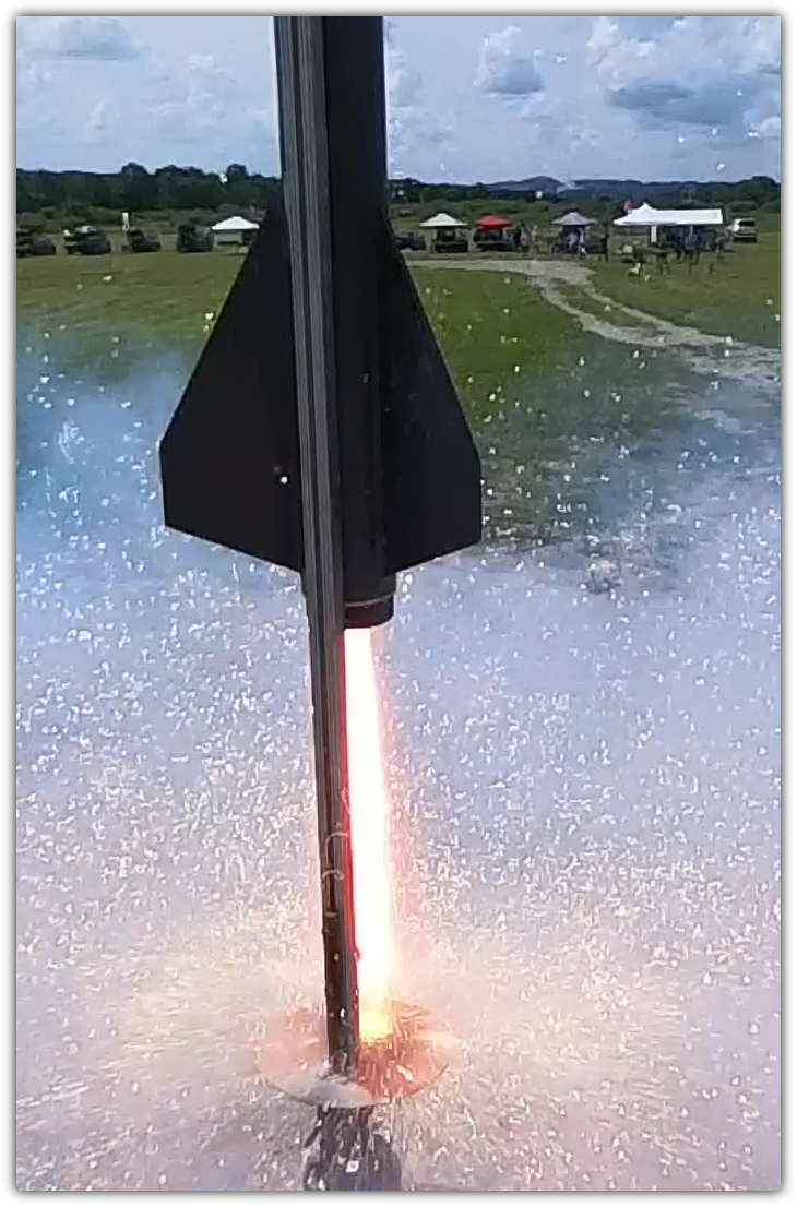 The Black Diamond M-1489 (98mm, 3 grain) Black Fire, Red Sparky motor, moments after ignition.