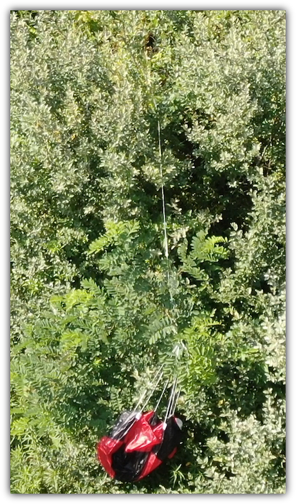 The drone lifts off at 4:33pm and after about 20 minutes is about to run out of battery and return for landing, when the L1 chute is spotted.
