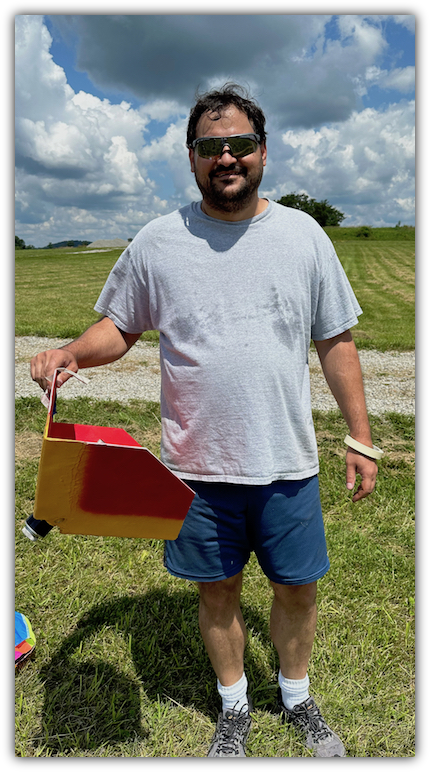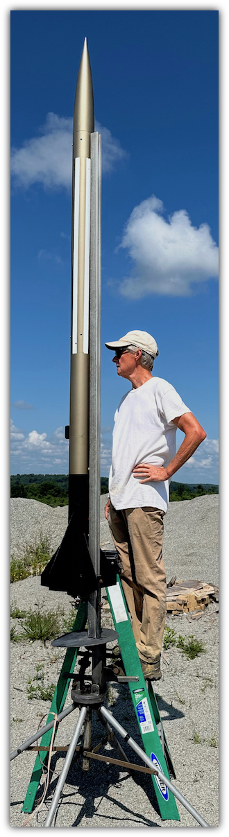 Jerry Andre is not just a prolific flyer of rockets, he is also a top notch builder. Here Jerry poses with one of his beauties that comes out on a regular basis: the Space Blaster.