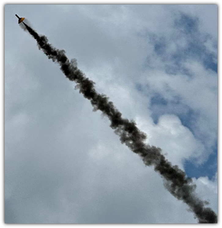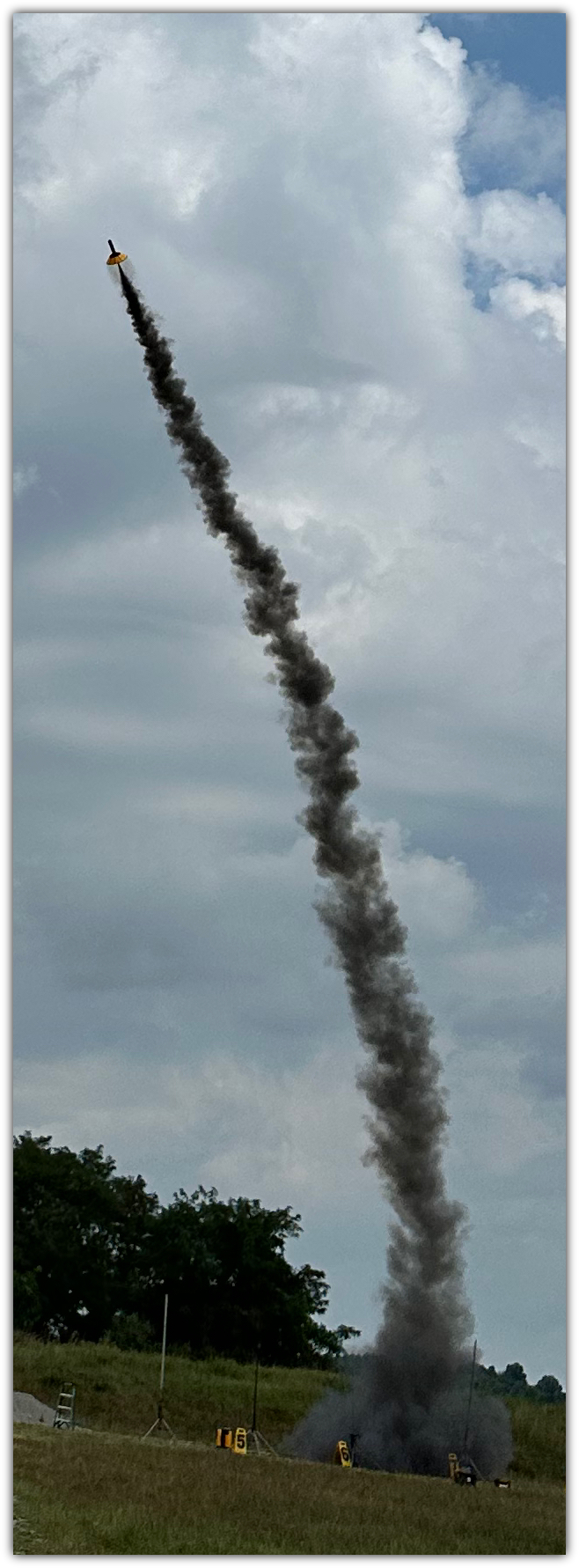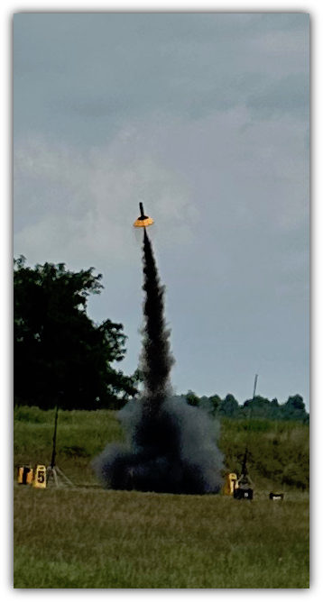 The Hot Sauce lifts off from the high power pads on a two grain, 54mm J-288 motor that John calls Dark Horse propellant.