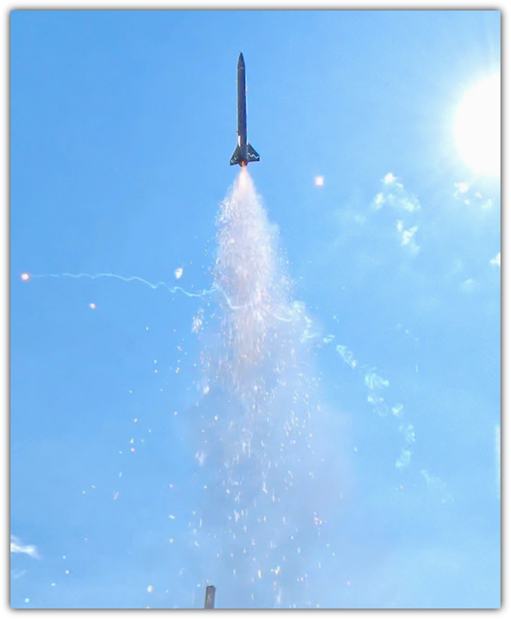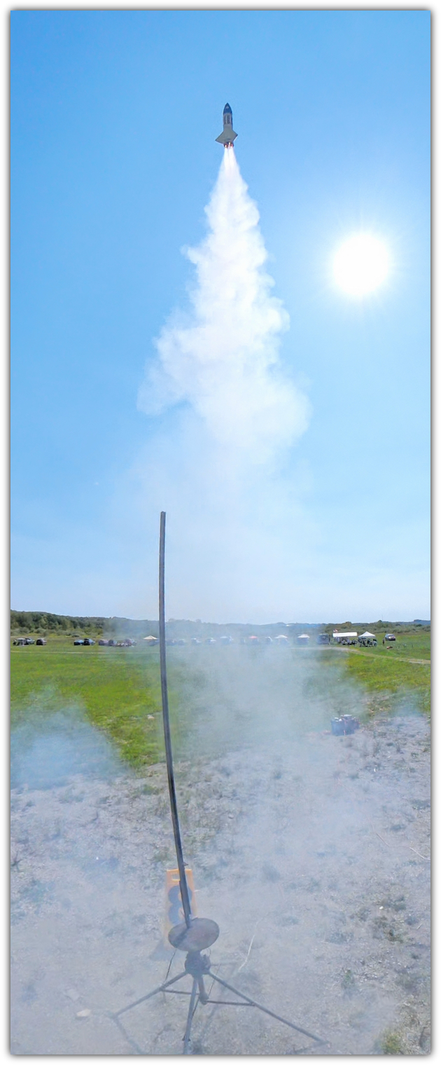 Sparks spit all over as the WIld Thang of John Haught lifts off. The Wild Thang was propelled by one of John's specialty motors, Jalapeno Popper formula.