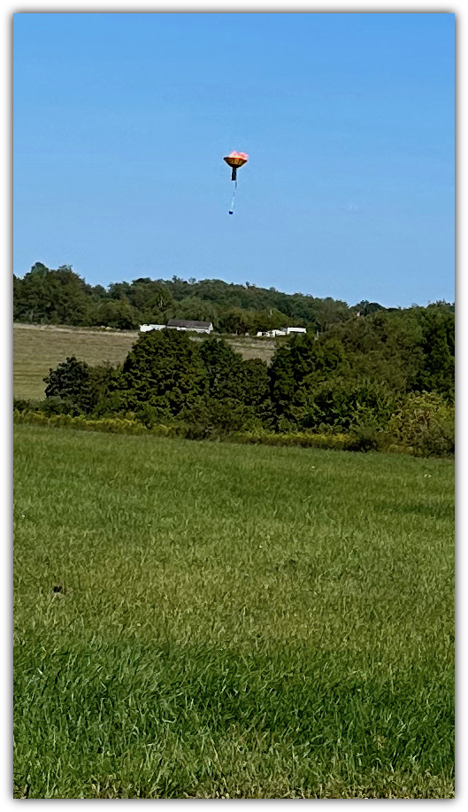 The Hot Sauce plummets toward the infield surrounded by the parachute.