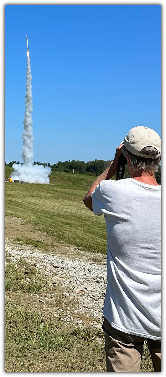 Winner of the 2022 George Pike award, Jerry Andre shows us all how to do it with his Yellow Mango. A 4" diameter rocket with air started motors and an onboard camera (see pics at left).