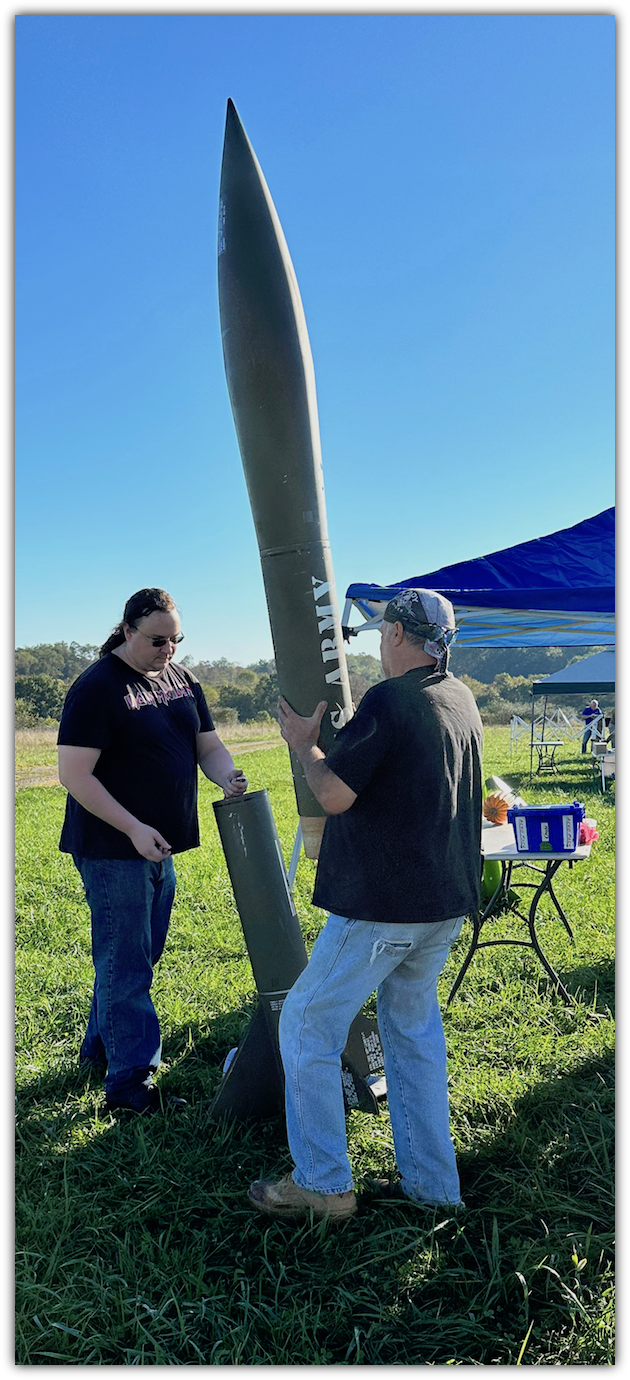 Casey Andre assists John Haught in the assembly of John's jumbo Honest John.