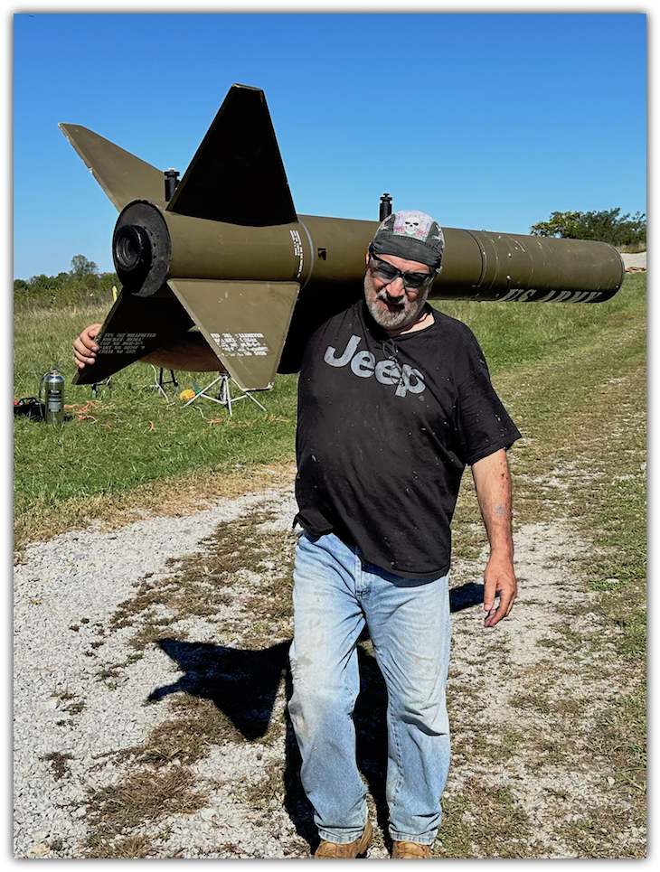 Standing nearly 10 feet tall, with a 7.5" main airframe diameter and a weight of just over 50 lbs empty, the Honest John is a handfull just to haul to the field.