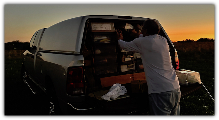Ken Allen nearly finishes packing his truck as the sun sets in October.