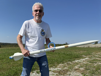 Joe Sheppard with his Estes-sized rocket that can attain half the altitude of a commercial airliner.