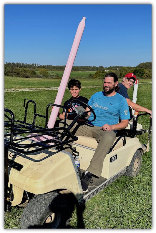 Emmett White returns with his pig-themed rocket Porcuelos while dad Brian drives the recovery vehicle. Jeff Dick rides along in back.